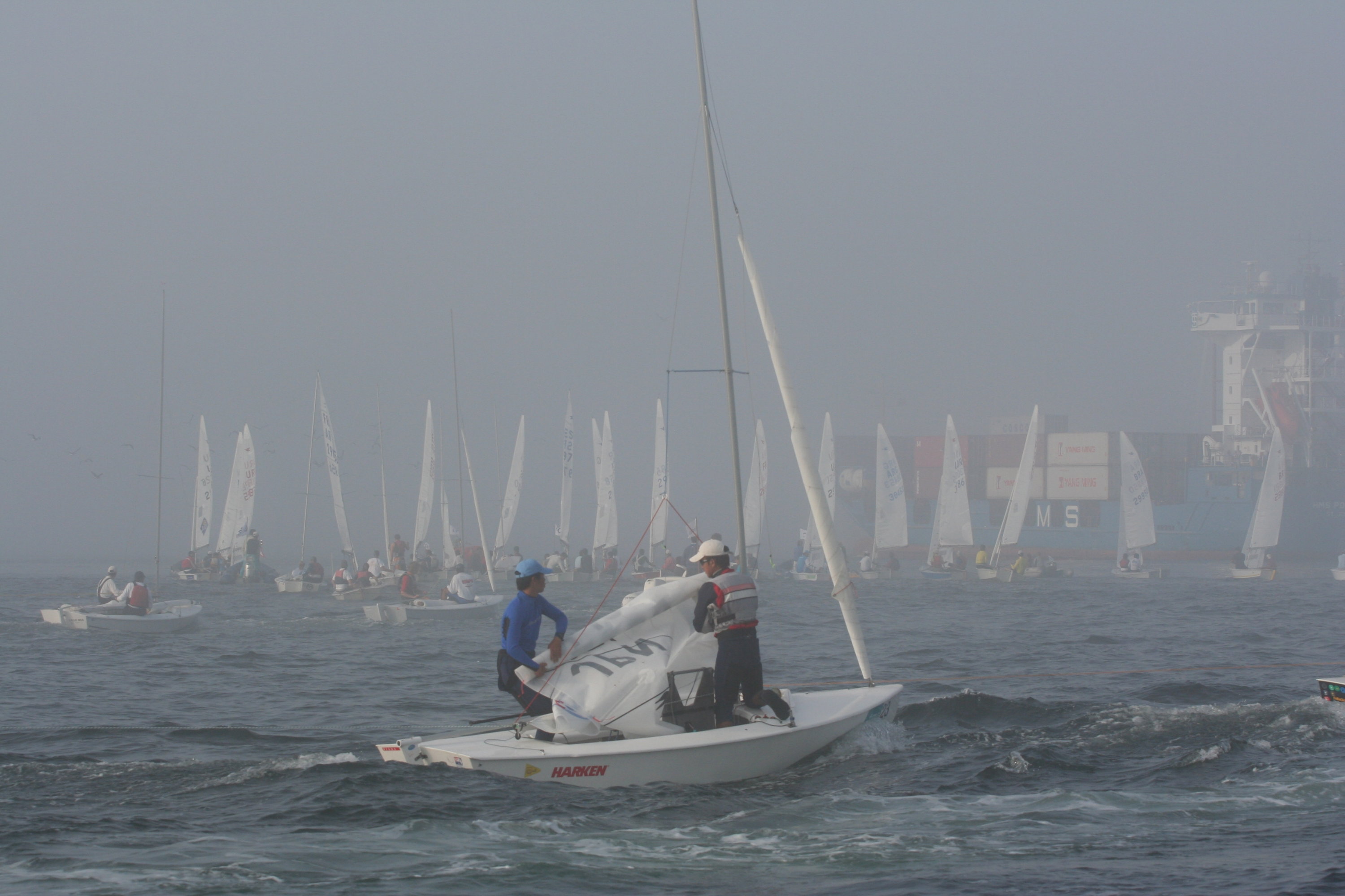 Qui a fianco Porto nella nebbia: le barche del Mondiale attendono il passaggio di una portacontainers (foto Michele Postinghel).