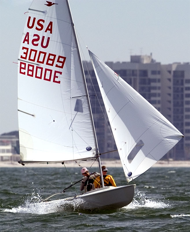 Se il vang è importante, l’archetto è la singola regolazione più importante per la velocità con vento forte. L’archetto (la congiungente delle due briglie in cui si divide la scotta della randa) dovrebbe essere tenuto direttamente sotto il boma quando il boma è cazzato nella sua normale posizione con vento forte. In questo modo cazzerete verso il basso il boma e perciò terrete l’ingresso del fiocco dritto senza catenaria. Quanto fuori potete andare con l’archetto? Io ho lascato sottovento il mio fino a 45 cm per tenere la barca piatta e il fiocco dritto; a quel punto il mio fiocco è regolato verso l’esterno 50 cm (misurati perpendicolarmente all’albero e contrassegnati sul paraspruzzi).