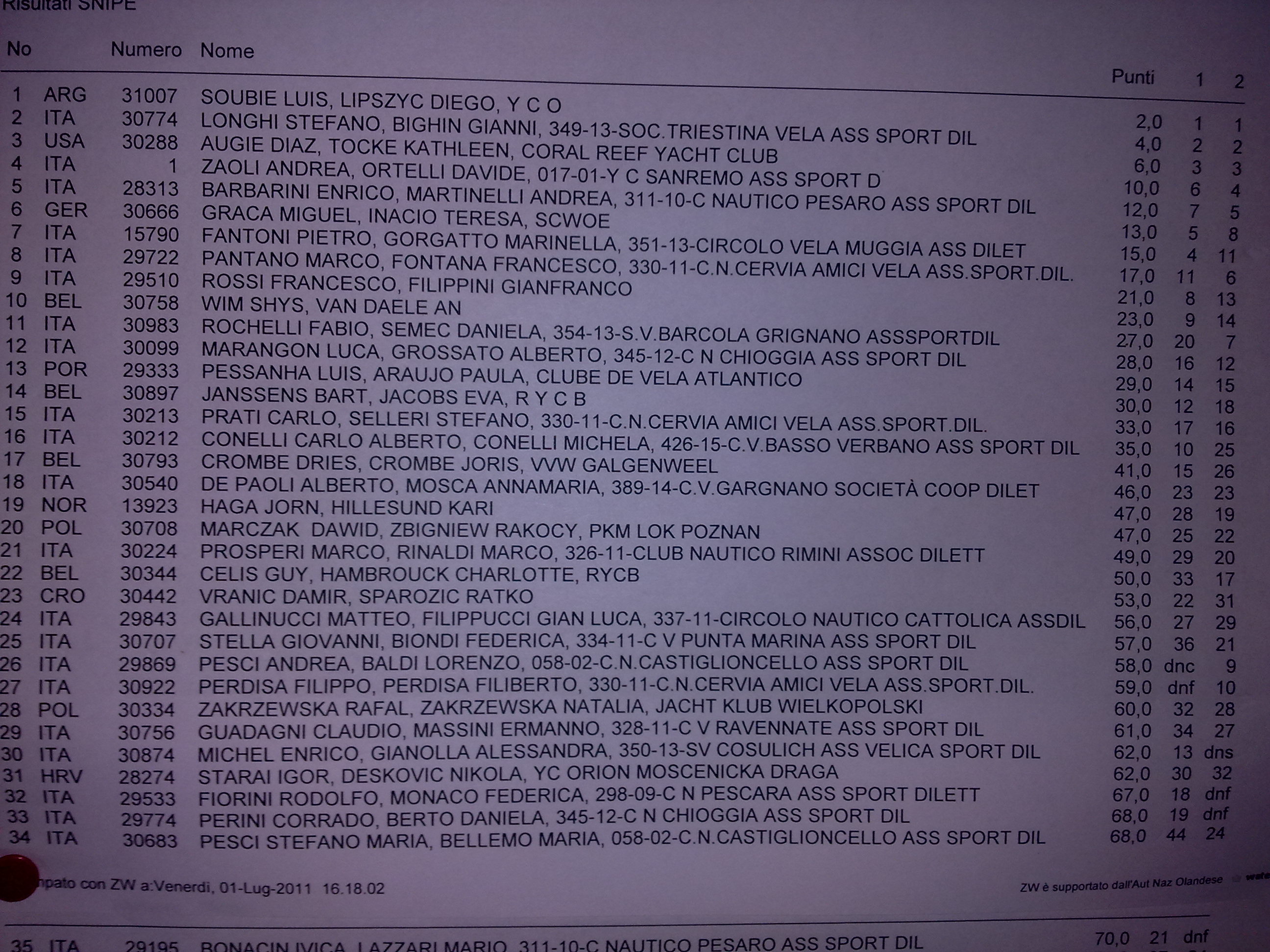 Molto indietro i campioni uscenti, i belgi Janssens & Jacobs. Fantoni & Gorgatto autori di una bella prova (quarti), ma naufragati nella seconda. La quarta posizione è occupata da Zaoli & Ortelli.