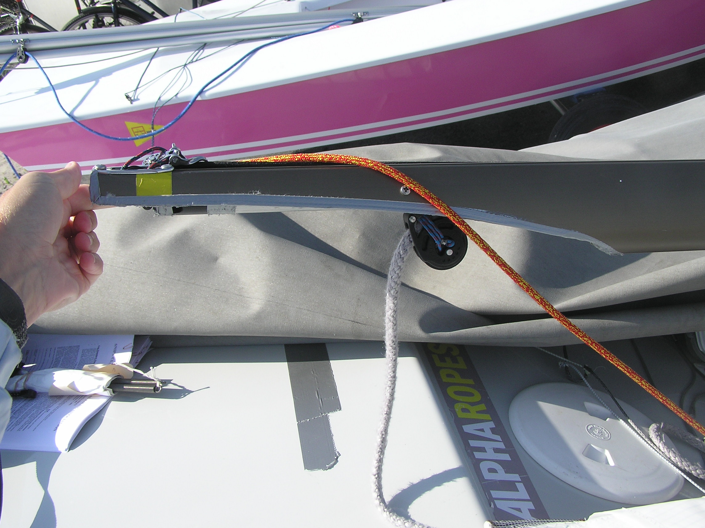 Il secondo vantaggio è rappresentato dal posizionamento del bozzello di poppa, assicurato all'interno della faccia superiore de boma. Immaginatevi la barca di bolina, la scotta della randa cazzata e le due "briglie" che formano l'archetto entrambe in tensione. In queste condizioni avrete notato che Il boma, con il bozzello assicurato nella posizione "normale", cioé ad un golfare fissato all'esterno, tenderà a ruotare sottovento a causa della pressione del vento sulla randa, con il risultato che il boma non si troverà perfettamente al centro. Con questo soluzione, invece, il boma tenderà a ruotare sottovento in misura minore, proprio perché il fulcro (cioé il bozzello) è posizionato più in alto e più vicino alla vela.