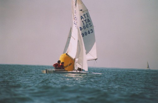 Ph.: "Staremo a vedere ... 'ndemo avanti! Lungo la bolina, alcuni salti di vento, dovuti per lo più al passaggio di nubi, mi consentono di recuperare. Gira la prima bolina nell'ordine Napoleone, poi tu e terzo io. Alla boa di poppa sono terzo sempre dietro a te. Poi ho una collisione con ITA 29954 che rimane mure a sinistra un po' troppo dopo la boa. Alla fine della seconda bolina io e Fabio ci allunghiamo un po' più a destra di Alejandro Cabeza e ci presentiamo così sulla lay line con il vantaggio delle mure."