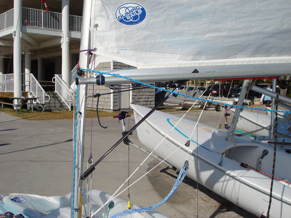 Peter Commette, oggi, con le previsioni di vento leggero, ha montato il sistema qui a fianco. E' costituito da due tubicini di materiale plastico preflessi e fissati all'albero e al boma.