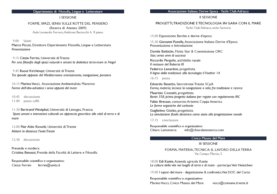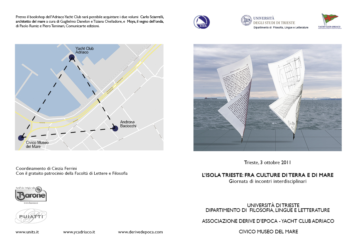 L'isola Trieste - Fra culture di terra e di mare. L'incontro tra AIDE, Trieste ed il mondo della Classe Snipe ha dato ottimi frutti, generando la collaborazione con il Dipartimento di Filosofia dell'Università locale sul tema della dialettica terra-mare così sentita a Trieste, con il Civico Museo del Mare, lo Yacht Club Adriaco, gli storici della marineria, i progettisti, dalla frontiera tecnologica del Sincrotrone e della Coppa America alle barche storiche agli Spirit of Tradition, i coltivatori e produttori di terra e di mare. Già da sabato e domenica saranno esposti davanti allo YCA lo Snipe d'epoca Veloce, il cat boat spirit of tradition Feather 14' ed altre derive d'epoca. Compatibilmente con le attività veliche che includono la Sciarrelli Cup, se possibile sarà effettuata anche una uscita in mare. Il programma è descritto nei dettagli nell'allegato.