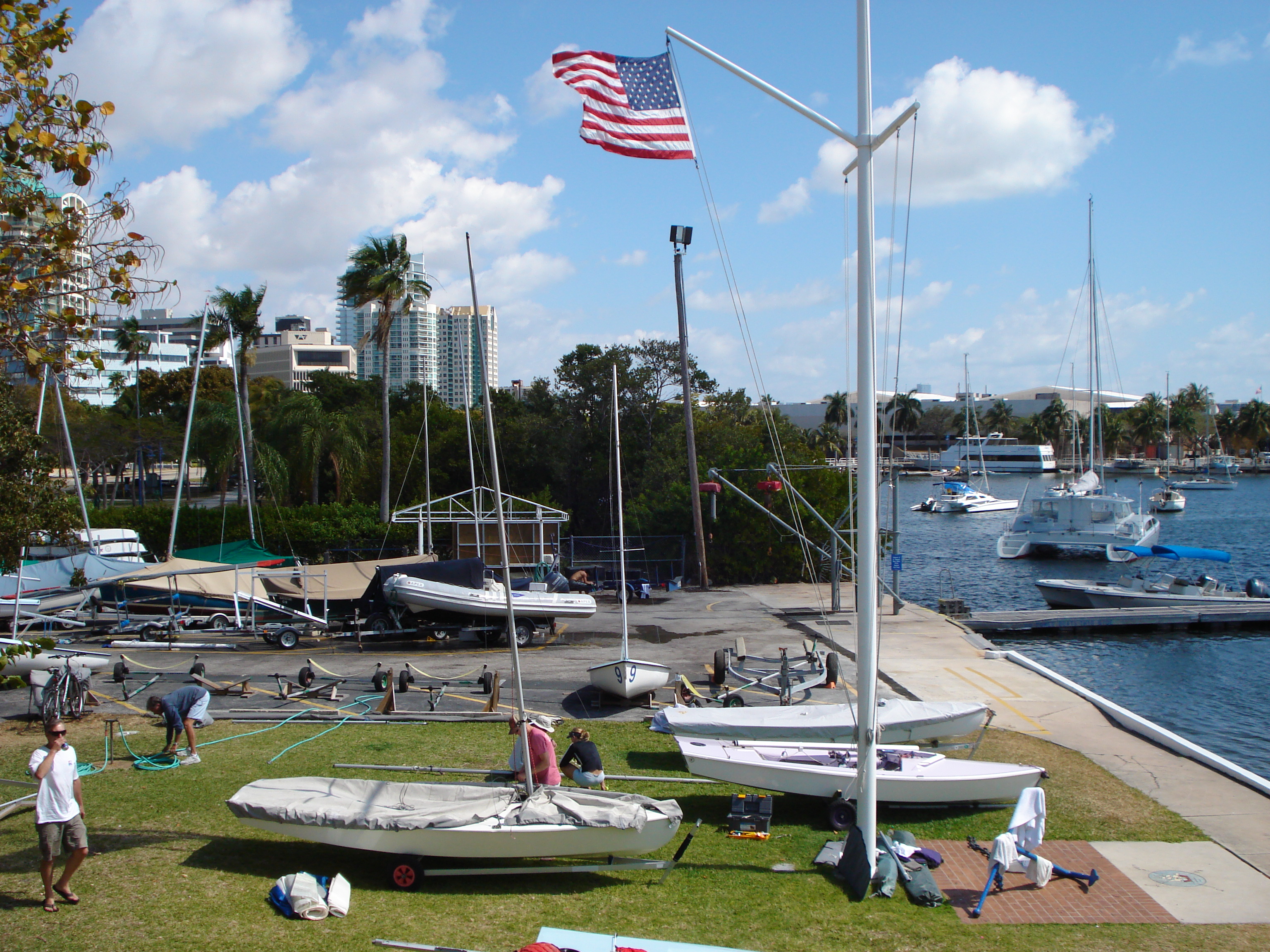 Questa mattina siamo andati, con molta calma, al Coconut Grove Sailing Club. E' uno dei circoli che piacciono a me. Esenziale e senza orpelli. Le barche si tengono su un bel prato all'inglese e scendono in acqua con le gru (gli scivoli non ci sono e così si fa meno fatica). Di fronte al circolo due isole formano un porto naturale molto protetto. Ancorate alla ruota ci sono un centinaio di barche, quasi tutte a vela. Oltre le isole, attraverso uno stretto canale si esce nella Biscayne Bay. Mentre verso terra, dietro al circolo ci sono i nuovi grattacieli del quartiere di Miami Coconut Grove. La Biscayne Bay è uno dei migliori posti dove andare in barca a vela: sole, caldo e una buona brezza.
