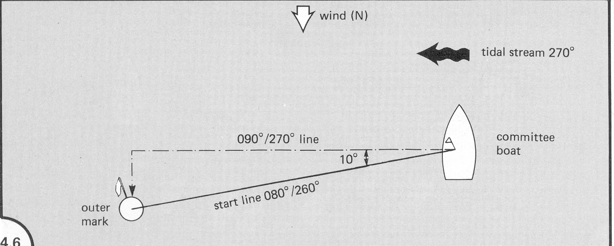 La figura esaspera quanto accaduto nella realtà a Cervia. Qui la corrente è a 90 gradi rispetto al vento reale e la sua intensità è pari alla metà della velocità del vento (6 nodi di corrente e 12 di vento), tanto che il vento apparente sull’acqua appare molto deviato a sinistra. Anche con correnti meno forti, ma comunque significative, gli effetti sul posizionamento della linea di partenza sono determinanti.