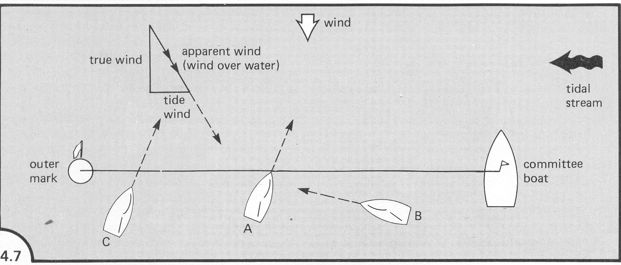 Immaginiamo ora una barca non ancorata, in assenza assoluta di vento, su cui agisce la corrente. Essa si muoverà - dice Stuart Walker – come fosse su un tappeto rispetto al pavimento. Lo spostamento dovuto alla corrente creerà il vento di corrente (tide wind) di intensità pari alla forza della corrente e di verso opposto.