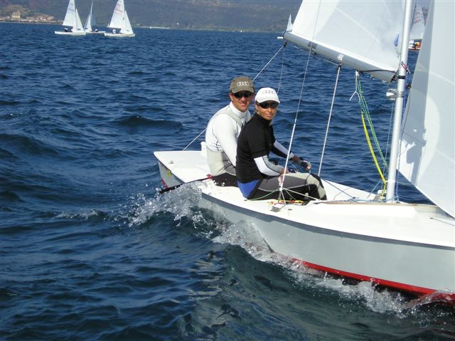 Si inizia giovedì 25 con vento sui 7 nodi. Percorso a bastone. Io ed Alberto Piccinini, senza alcuna regata alle spalle, a parte l'Open di Francia dell'anno scorso, partiamo bene e, facendo la prima bolina a destra, guadagniamo molto. Giriamo in testa tutte le boe. Dietro di noi l'equipaggio Campione del Mondo Master 2004 (a ruoli invertiti) Nocera - Maurizi. Terzo Enrico Solerio con Elena Vittori. Riamangono attardati due favoriti della vigila Poggi e Michel (16 e 14). Ottima prova di Apostoli - Venanzi, quinti, subito dietro al belga Van Cauwenbergh.